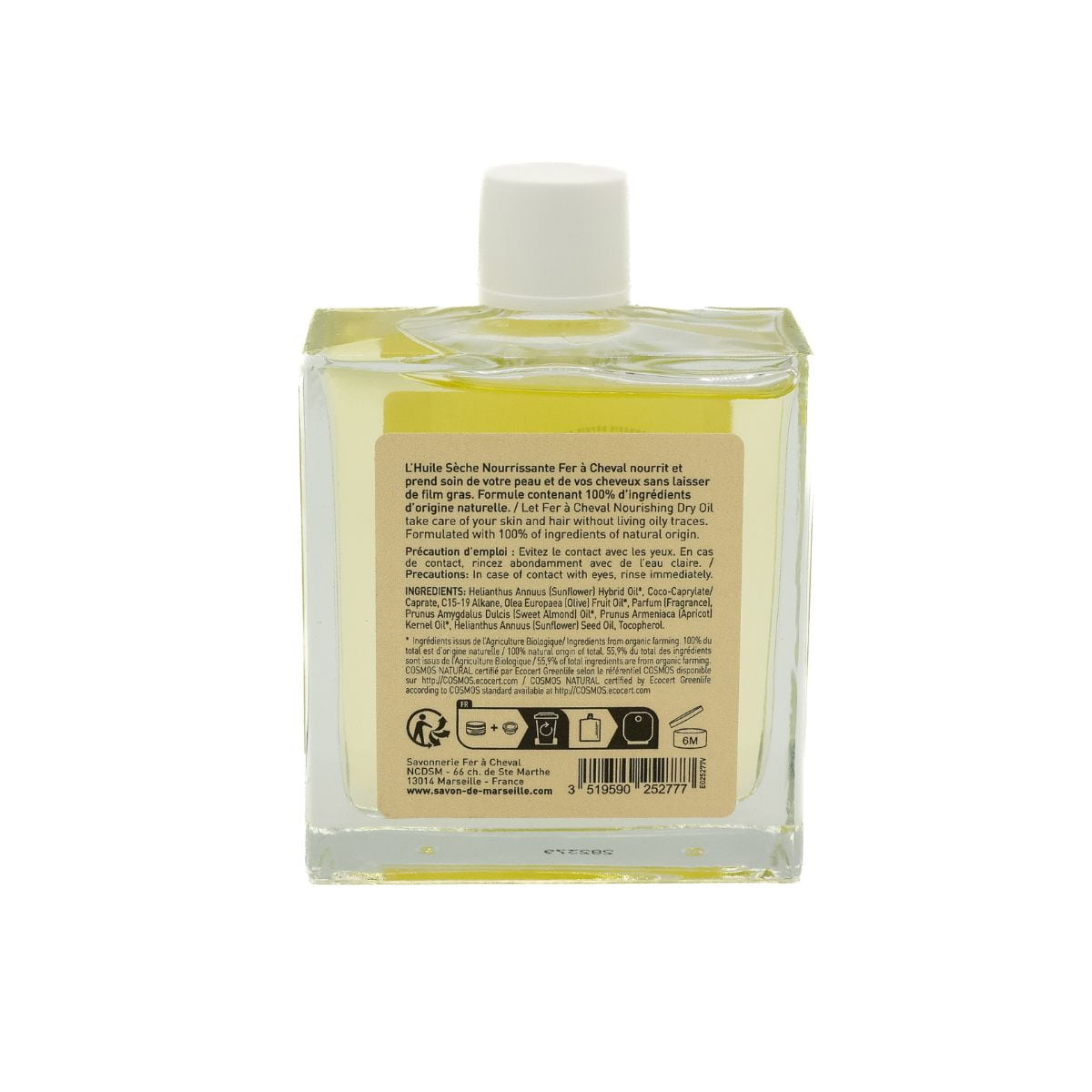 Este aceite seco cuenta con el certificado COSMOS NATURAL por Ecocert Greenlife según el estándar COSMOS disponible en https://COSMOS.ecocert.com.