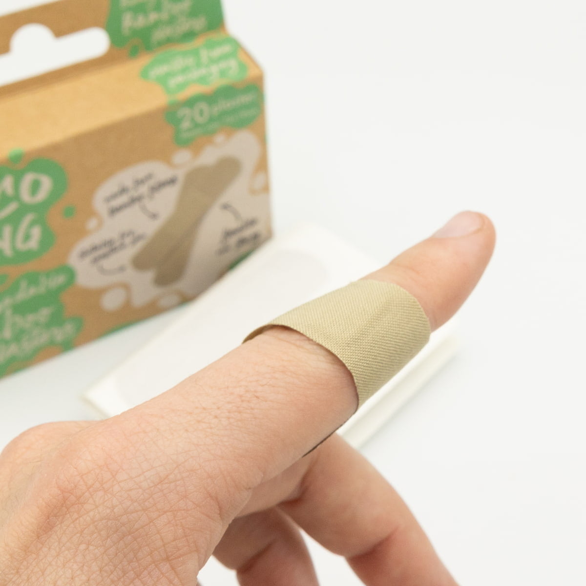 Los apósitos biodegradables y ecológicos están compuestos de un 50% fibra de bambú, 50% pulpa de madera y adhesivo acrílico.