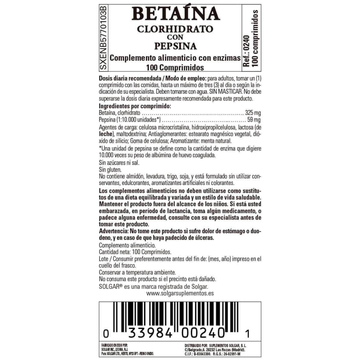 Betaína clorhidrato …………………325 mg