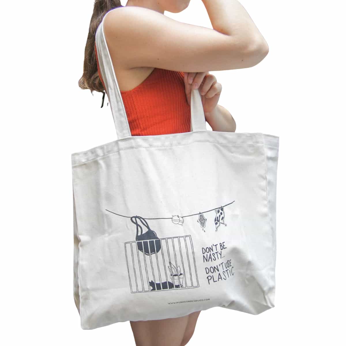 Toda la fabricación, producción y diseño de la bolsa de tela reutilizable es 100% local. Su bonito diseño y mensaje es obra del blog sobre vida sostenible Mundo Sin Residuos.