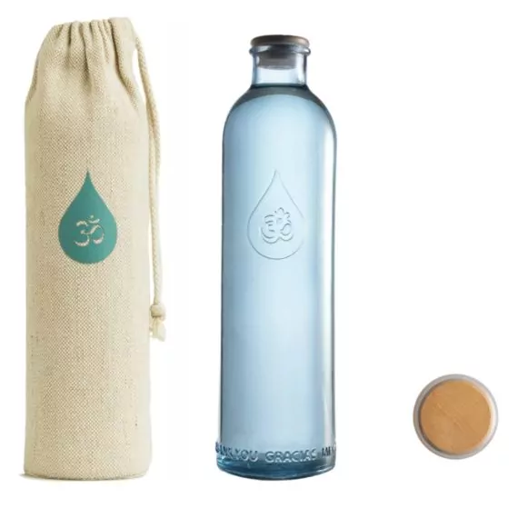 Al cuerpo de vidrio de la Om Water Gratitude, se ha incorporado una resistente funda de tejido de algodón y cáñamo y el tapón hermético de madera y silicona para que puedas llevarla contigo a todas partes. La Om Water Flying Gratitude está preparada para ti y para tus experiencias.