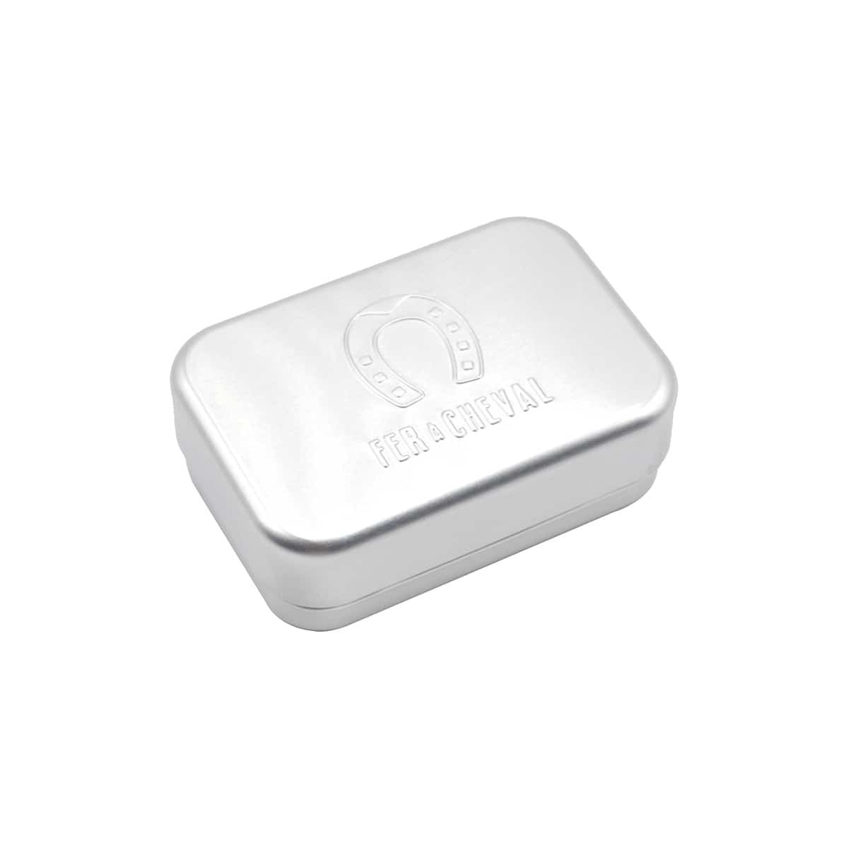 La cajita metálica de Fer à Cheval incluye en su interior un soporte para jabón. Es muy útil durante los viajes, pues puedes extraer esta bandeja recogegotas y utilizarla como una jabonera convencional. Simplemente, extráela y sitúala sobre el lavabo, de manera que facilite la evacuación del exceso de agua del jabón y evite que este se pegue. También puedes dejar la jabonera dentro del soporte inferior para que el agua que escurre quede dentro de la cajita. Asegúrate de irla limpiando para eliminar restos de agua y de jabón.