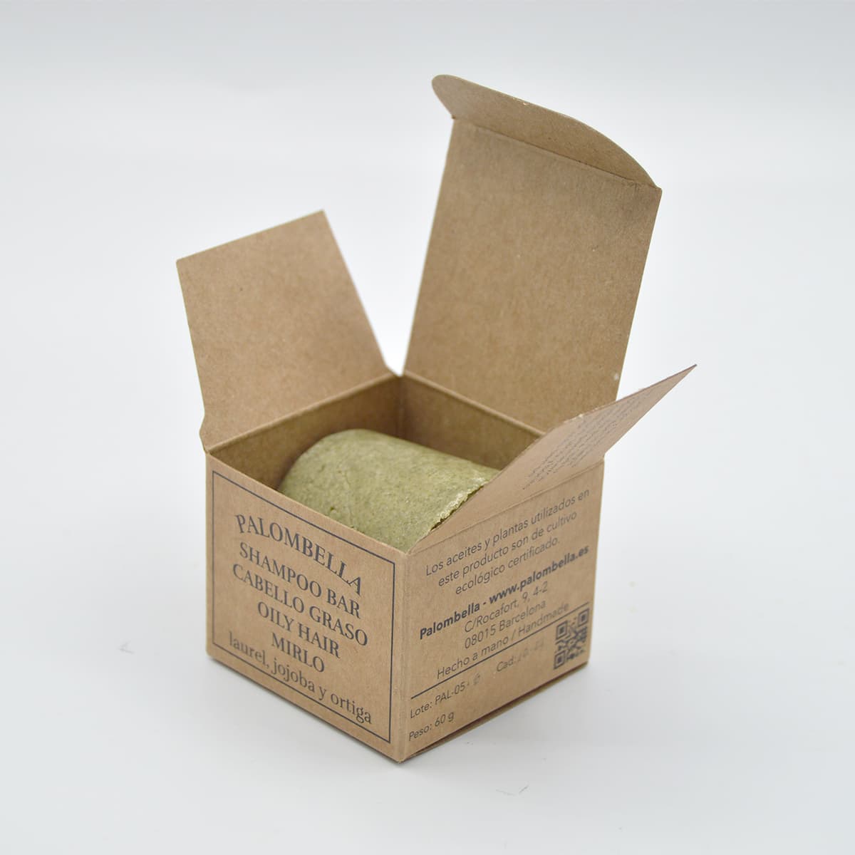 Este champú sólido vegano y ecológico viene en una caja de cartón producida con materias primas de bosques sostenibles.