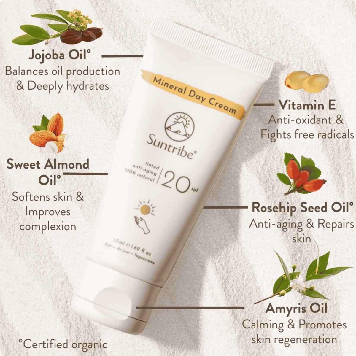 Descubre una crema de día multifunción que se adapta a tu piel y a tu estilo de vida. La Crema de Día Mineral con Tinte SPF 20 de Suntribe combina protección solar, hidratación y efecto unificador en una fórmula 100 % natural y ecológica.