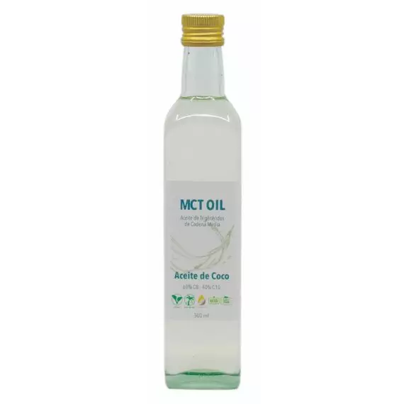 Aceite compuesto por triglicéridos de cadena media (MCT, medium chain triglycerides) que proporcionan un 60% de ácido caprílico (C8) y un 40% de ácido cáprico (C10). Estos ácidos grasos de 8 y 10 carbonos, se digieren, se absorben y se metabolizan de forma diferente que los ácidos grasos de cadena larga. Al ser más hidrosolubles, no se incorporan a los quilomicrones y no participan directamente en la lipogénesis. Ideal como complemento a las dietas cetogénicas (dietas KETO) o como fuente de energía en deportistas. Apto para veganos.
