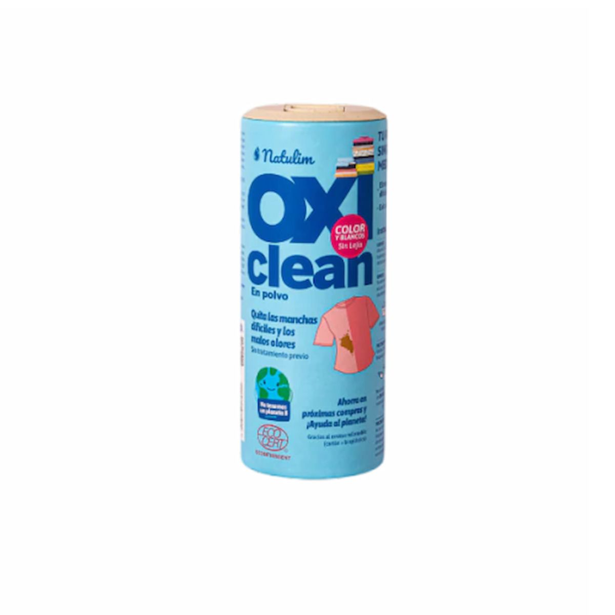 El Oxi Clean viene en un tubo de cartón con tapa de bioplástico. Incluye cucharita medidora de caña de azúcar.