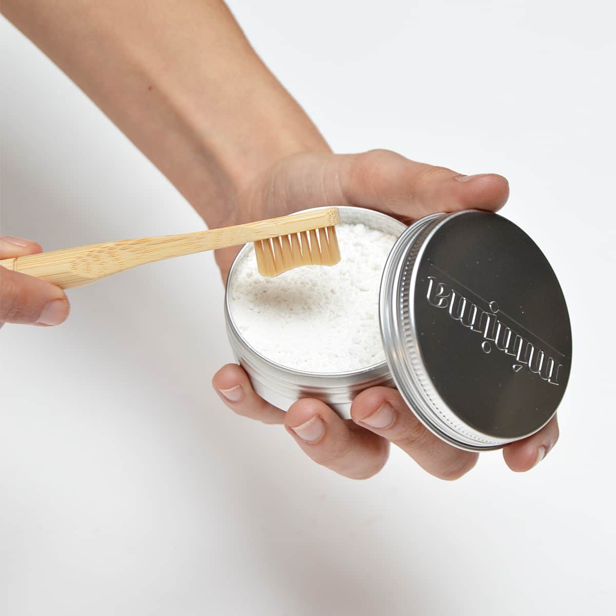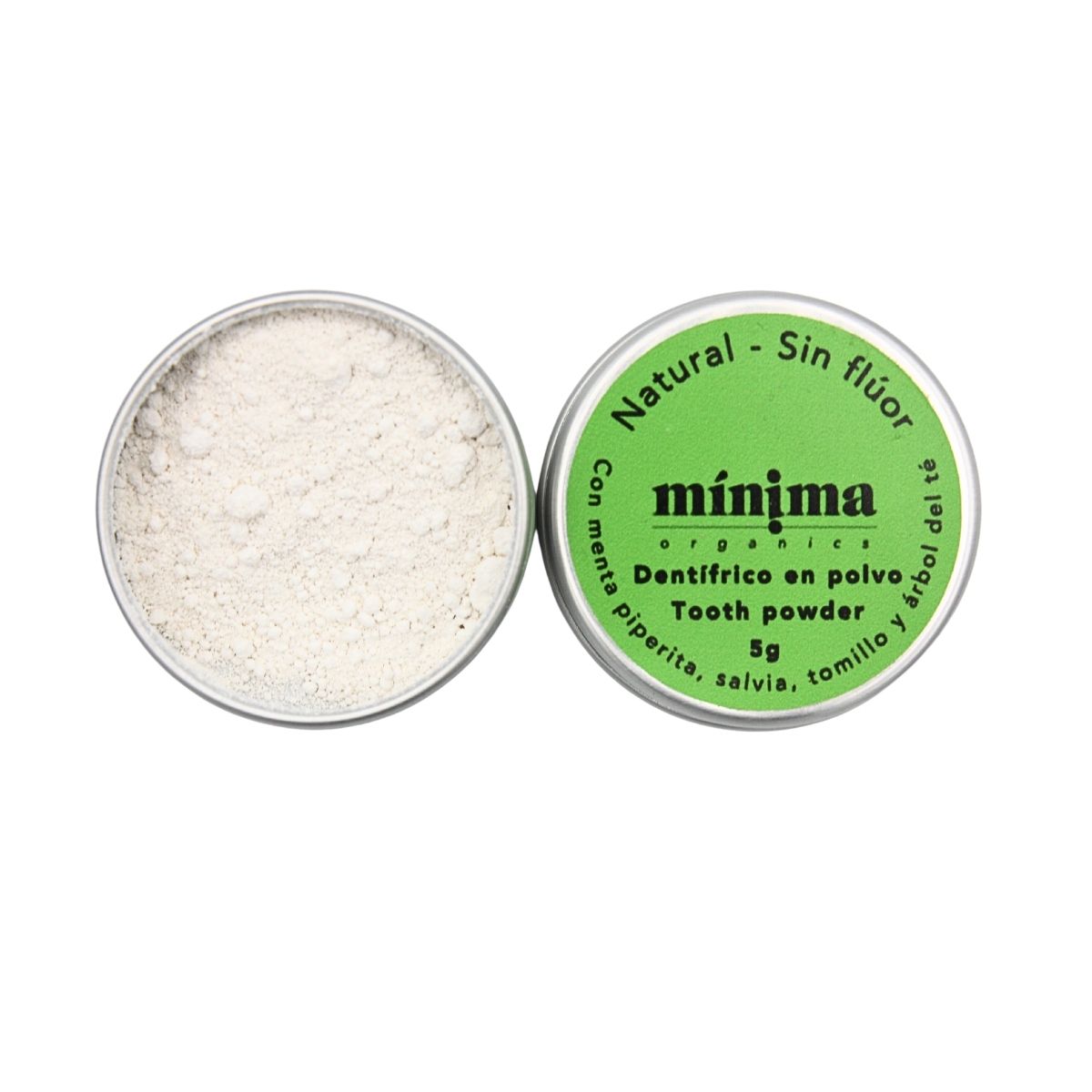 Los polvos dentales vienen contenidos en una lata de aluminio con una protección de seguridad sintética adherida. Esta, a su vez, se presenta en el interior de una caja de cartón reciclable.
