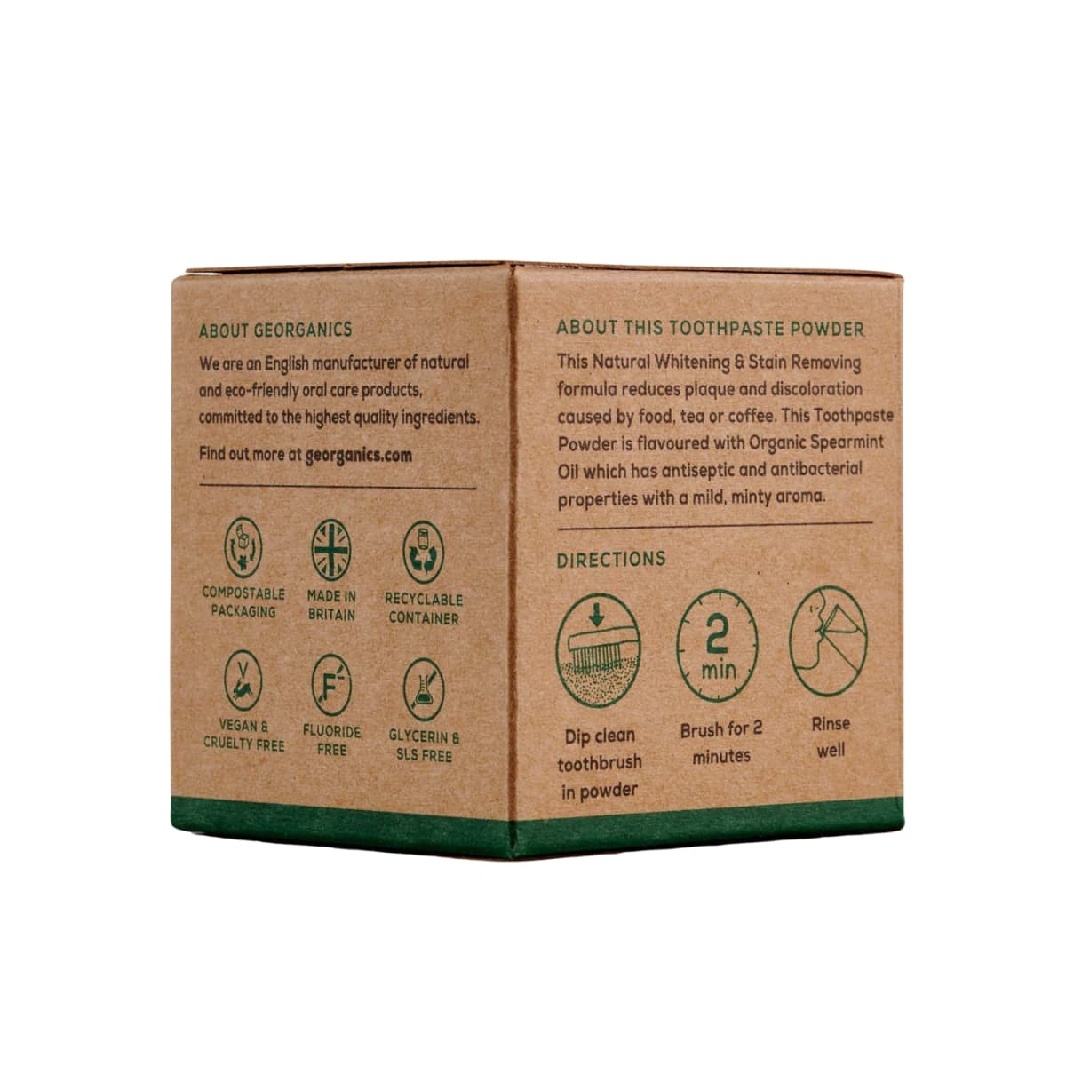 Este polvo blanqueador fino, natural y sin tóxicos funciona absorbiendo y puliendo las manchas y la placa que se forman de manera natural en los dientes. Es una fórmula completamente segura y efectiva hecha sin el uso de productos químicos como peróxidos, flúor o saborizantes sintéticos. Mezcla dos de los agentes blanqueadores más efectivos y naturales, el bicarbonato de sodio fino de grado farmacéutico (muy poco abrasivo) y el carbonato de magnesio ambos de grado alimentario, lo que los hace completamente seguros si se ingieren accidentalmente.