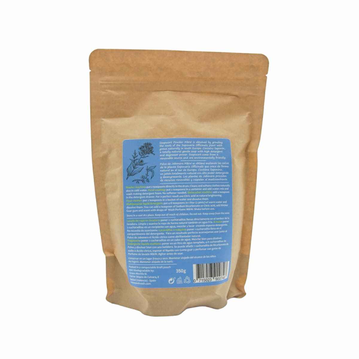 El polvo de jabonera se presenta envasado en una bolsa 100% biodegradable y compostable, dentro de una caja de cartón.