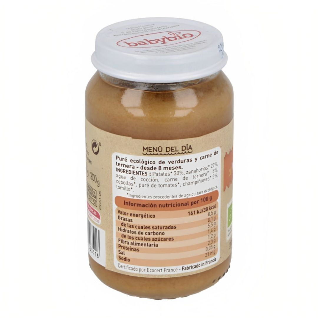Verduras* 78.5% (patatas *29.5%, zanahorias*26%, tomate* 10%, cebolla*, champiñones* 5%), agua de cocción**, carne de ternera* 8%, tomillo*.