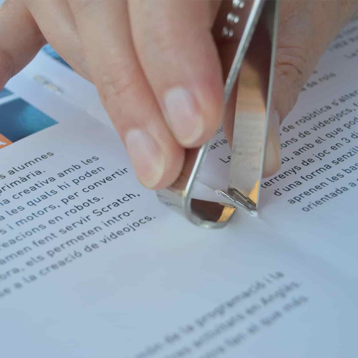 Situar el quitagrapas en la parte delantera de la grapa y presionar. La grapa saltará automáticamente.