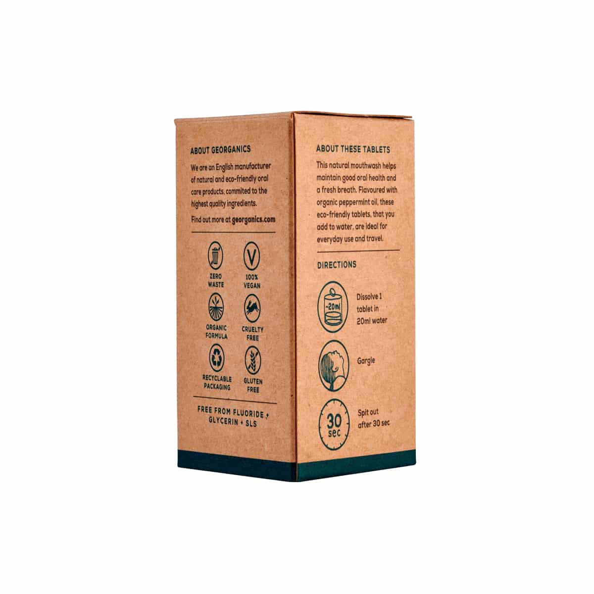 Las tabletas de enjuague bucal de Georganics están hechas de ingredientes completamente naturales, de calidad alimentaria y sin tóxicos. La fórmula libre de flúor, glicerina y SLS ayuda a restablecer un equilibrio de pH saludable en la boca, mantiene una buena salud oral y refresca el aliento. Estas tabletas de colutorio bucal natural son perfectas para viajar, ya que evitan el transporte innecesario de agua. Son una alternativa más ecológica que los enjuagues bucales tradicionales. Cada frasco de vidrio contiene 180 tabletas, lo que equivale a 3 meses de uso usando dos tabletas al día. El formato ahorro incluye 720 tabletas que da para un año usándolo 2 veces al día.