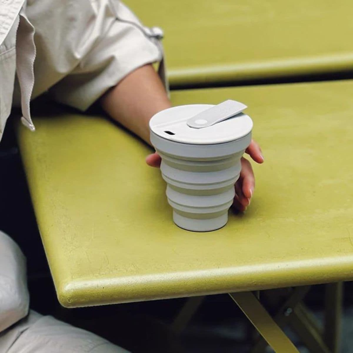 El vaso de café plegable HUNU está fabricado con silicona de grado alimenticio y su tapa es de fibra de bambú.